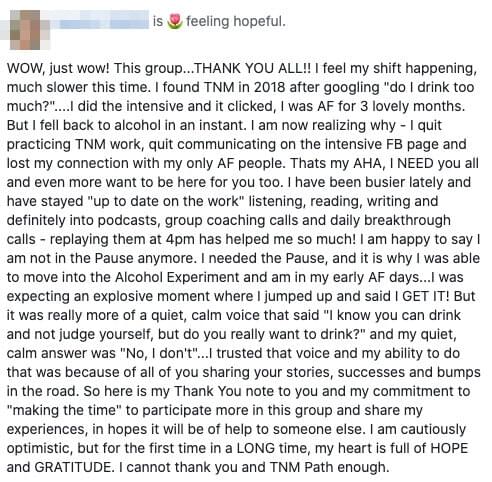 Most PATH members stop drinking entirely about 4 months in. And then they go from their behavior changed (stopping drinking) to their mindset changing (being truly free and happy about it after that).
