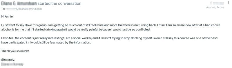 I feel so comforted that I finally have the answer to my alcohol addiction. This has been a life-saver- I had been struggling with the philosophy of AA for 23 years, but eventually I turned back to alcohol because it never made sense to me (without going into details). I have a scientific mind, and find all the information relevant and realistic. Extremely happy that the information is easy to follow and it's POSITIVE- thank-you Annie. Also, I never feel alone now that I have my online community.” - T.D.